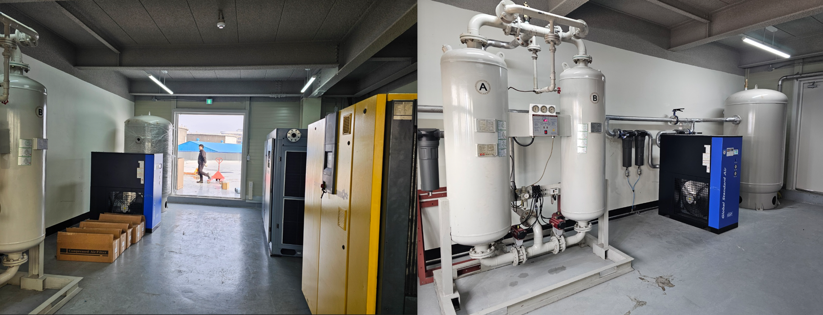 CA150VSD(150마력) 인버터 콤프레샤, 100마력 케져 중고 콤프레샤 (예비용), 100마력 AIR DRYER, AIR RECEIVER TANK , 흡착식 AIR DRYER 의 구성으로